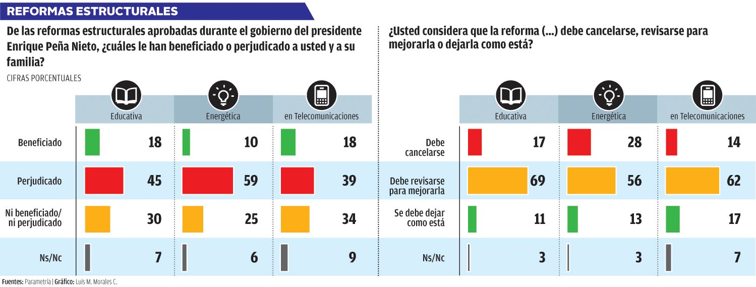 Es importante mencionar que la mayoría de los votantes que acudieron a las urnas el pasado 1 de julio esperan que tanto la reforma educativa como la energética y la de telecomunicaciones se revisen para mejorarse. Incluso sobre la reforma energética, que es la más impopular, son más quienes esperan modificaciones que aquellos que prefieren que se cancele (56 por ciento contra 28 por ciento).