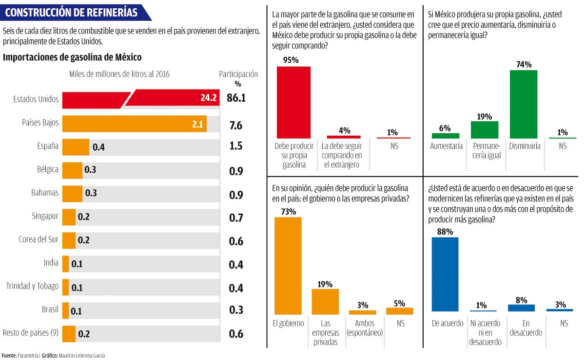 Al igual que la postura del gobierno electo el pasado 1 de julio, la mayoría de entrevistados consideran que México debe producir su propia gasolina y dejar de comprar en el extranjero. Esta posición es apoyada por 95 por ciento de las personas. El origen de este punto de vista nacionalista puede venir de la vieja idea de autonomía, independencia económica y de la expectativa de que, de producirse en el país, los precios bajarían.