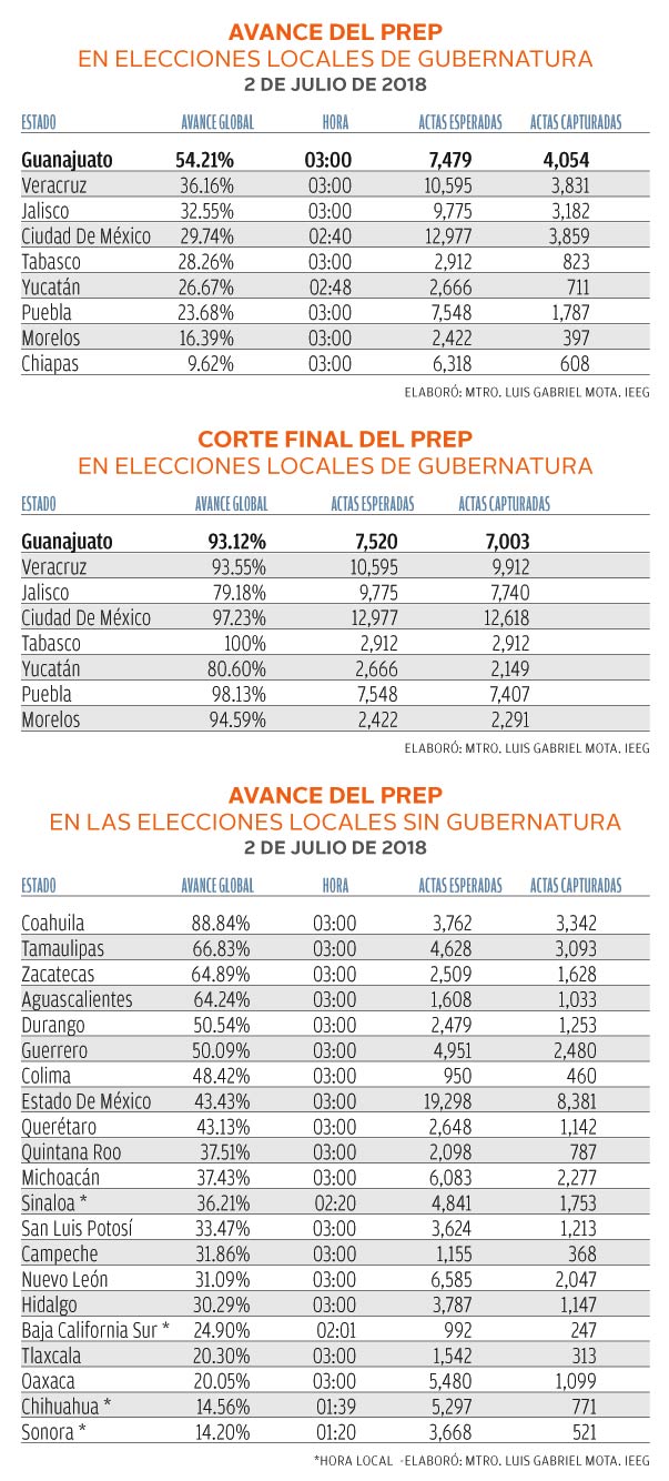 Con base en información que recolectó y organizó el maestro Luis Gabriel Mota, director de Cultura Política y Electoral del IEEG, puedo aventurar que el PREP local que mejor se desempeñó en las nueve entidades con renovación de sus gubernaturas, fue el guanajuatense. Nuestros Capacitadores Asistentes Electorales pudieron capturar las imágenes de las actas de casilla, y trasmitirlas con oportunidad a los Centros de Recolección y Trasmisión de Datos, donde éstos eran capturados por partida doble, cruzados y supervisados. Desde las 20:00 horas de la jornada electoral comenzaron a fluir sin interrupción, y la ciudadanía y los partidos políticos pudieron dar seguimiento gracias a su difusión mediante la página institucional y el apoyo de diez medios de comunicación difusores del PREP.