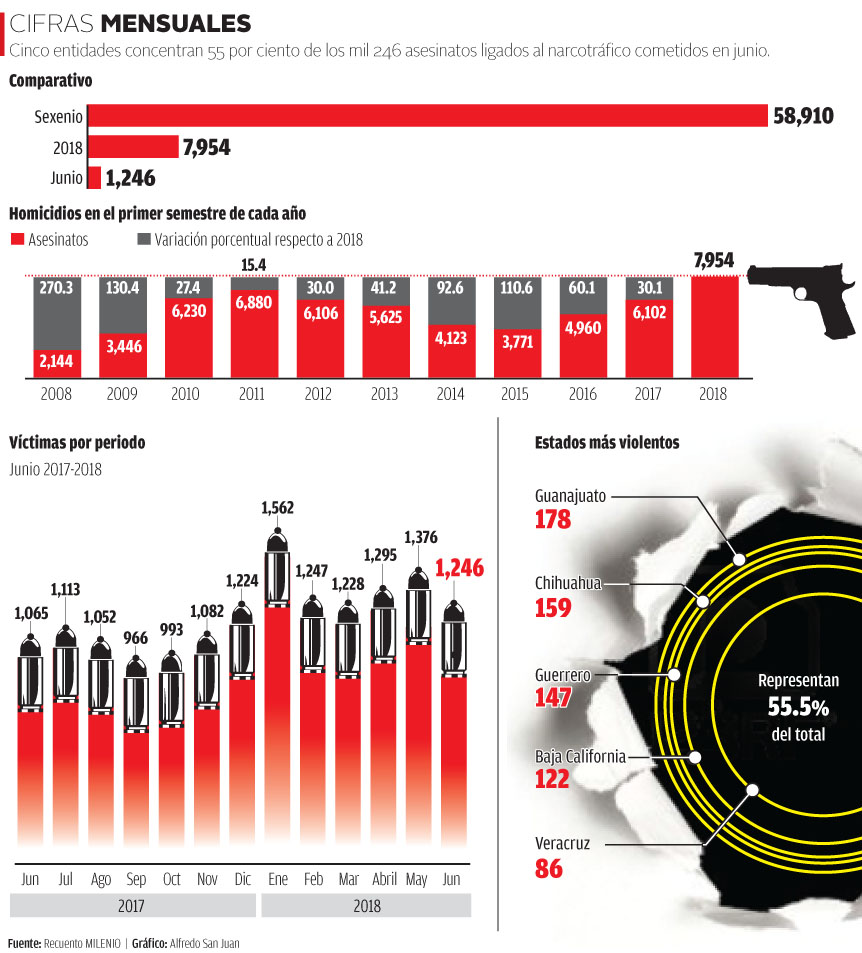 En el primer semestre de 2018 fueron asesinadas 7 mil 954 personas en hechos de violencia ligados al crimen organizado. Es el periodo enero-junio más sangriento que ha vivido México desde que MILENIO comenzó en 2007 el recuento de este tipo de crímenes.