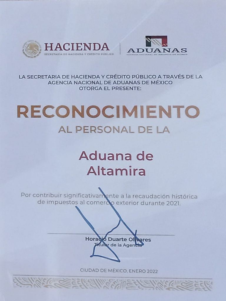 La Secretaría de Hacienda, mediante la ANAM, otorgó un reconocimiento a la Aduana de Altamira por una recaudación histórica en el año 2021. “Denota una transparencia en su operación aduanera e incentiva a su personal a superar dicha recaudación en este 2022”, expuso el titular Horacio Duarte Olivares.