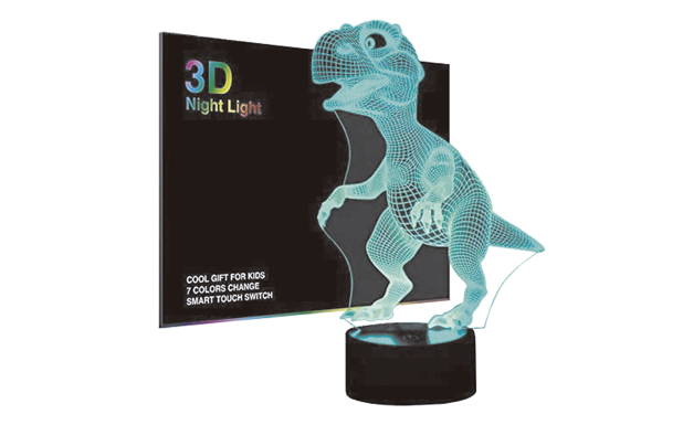 Lampara de noche 3D con 7 luces disponibles y que crea un efecto de holograma, es diseñada para que los niños puedan jugar con ella pulsando un botón.