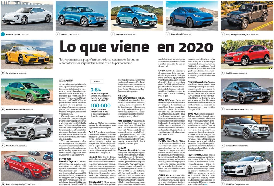 Toyota Supra. Luego de una ansiada espera desde que lo presentaron en 2014, ha llegado a México el modelo más “sexy” --y prácticamente el único-- de la armadora japonesa. Controversial por su tecnología alemana, provista por la mismísima BMW, con un motor turbo de 3.0 litros y seis cilindros, capaces de generar 335 hp y 365 lb-pie. Sorprende la alta calidad de sus acabados. El Supra es ya todo un modelo de culto.