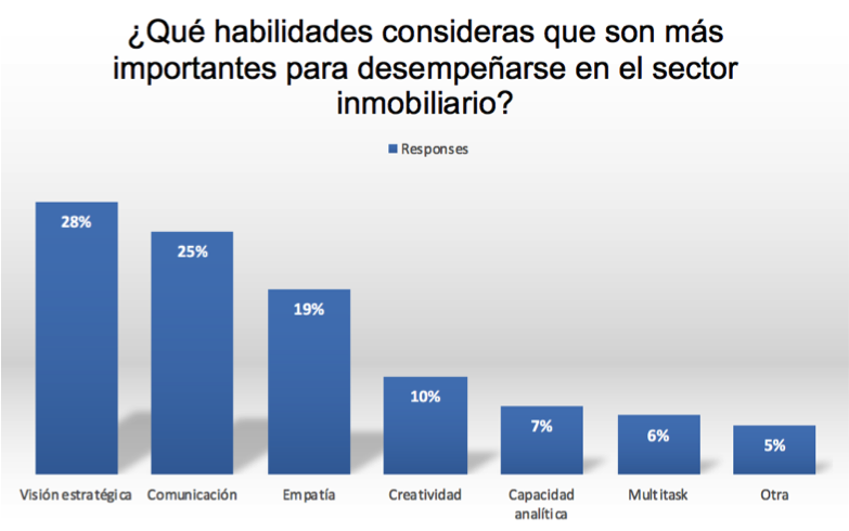 Por último, 28% consideró que una de las habilidades más importantes para desenvolverse en el sector inmobiliario es la vision estratégica, mientras que 25% expuso que la comunicación es el elemento con mayor relavancia para asegurar el éxito en esta actividad.