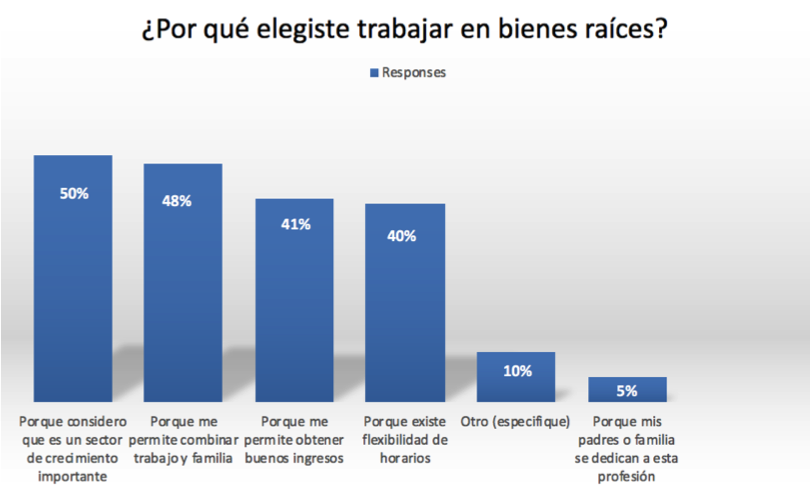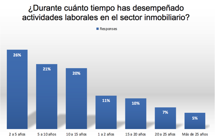 En esa línea, el sondeo arrojó que el sector inmobiliario es una industria que permite arraigo a las mujeres. Del total de participantes, 21% dijo que lleva entre 5 y 10 años laborando en la industria, mientras que 20% indicó que suma entre 10 y 15 años como profesional del sector. Cabe destacar que un 26% lleva entre 2 y 5% años desempeñándose en este sector por lo que se puede apreciar una incursión importante de las mujeres en esta industria.