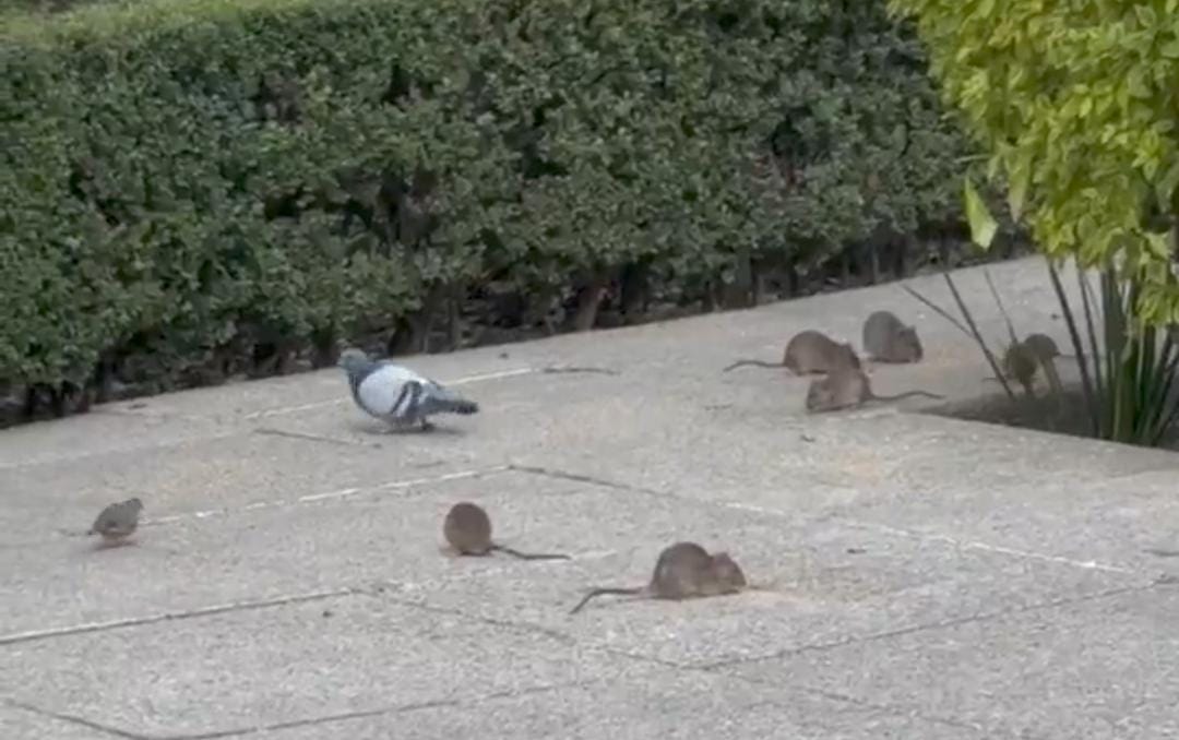 En el video se observan al menos siete roedores caminando junto con una paloma. -