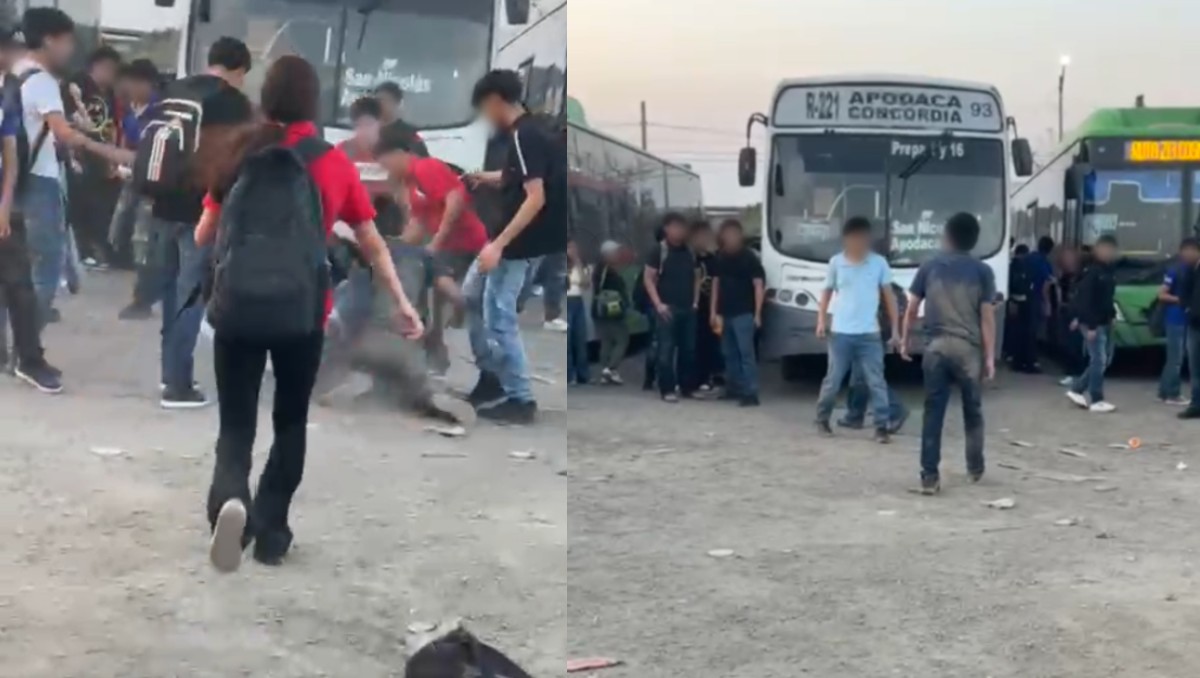 Un hombre y una mujer se involucraron en la riña de alumnos en Apodaca; otro video muestra que los terrenos de una ruta urbana se convierten en ring. -