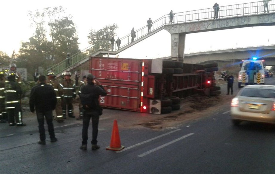 Un tráiler que transportaba 25 toneladas de madera se volcó en el cruce de Miguel Bernard y avenida Acueducto, por lo que hay reducción de carriles; el accidente no dejó heridos. -