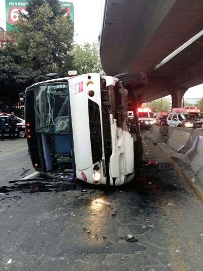 Al menos 10 personas resultaron lesionadas luego de que un camión de la ruta Azcapotzalco-Jacarandas se volcara a la altura de avenida Santa Mónica, en Periférico Norte. -