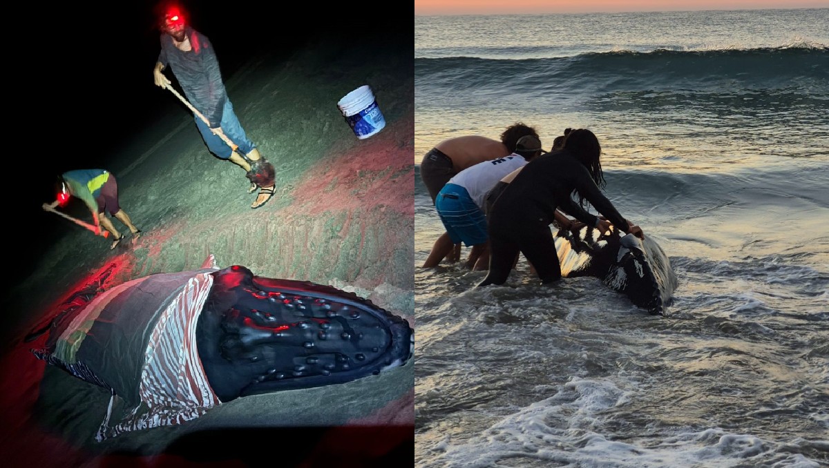 El ejemplar de ballena medía 4.60 metros y fue auxiliado por las autoridades de la Conanp. -