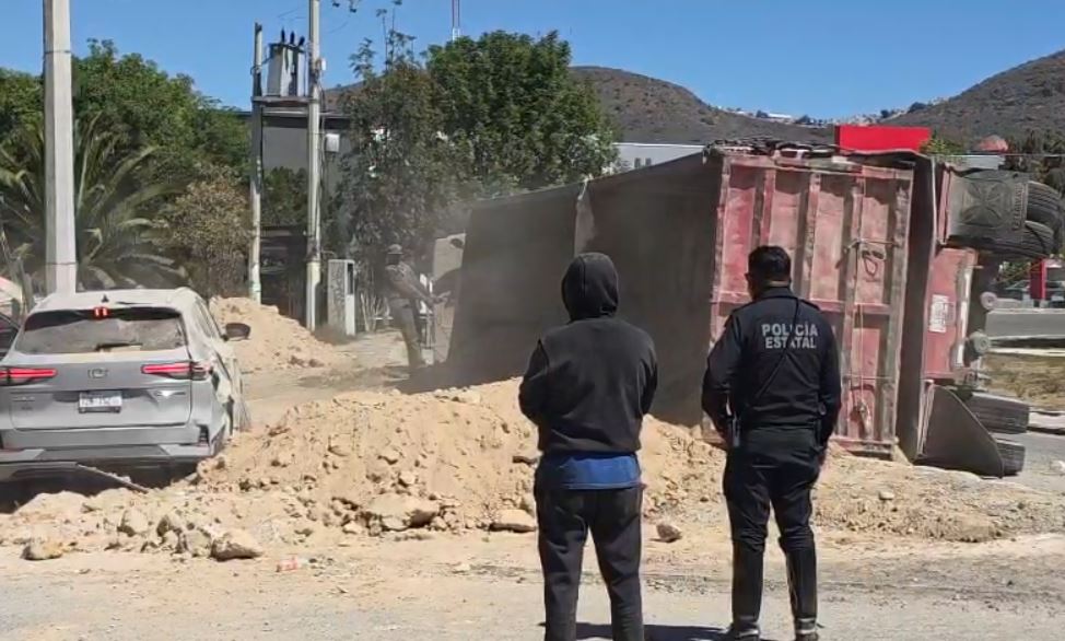 El accidente ocurrió en el distribuidor Vial La Paz, en la zona metropolitana de Pachuca, donde la carga cayó encima a dos vehículos particulares -