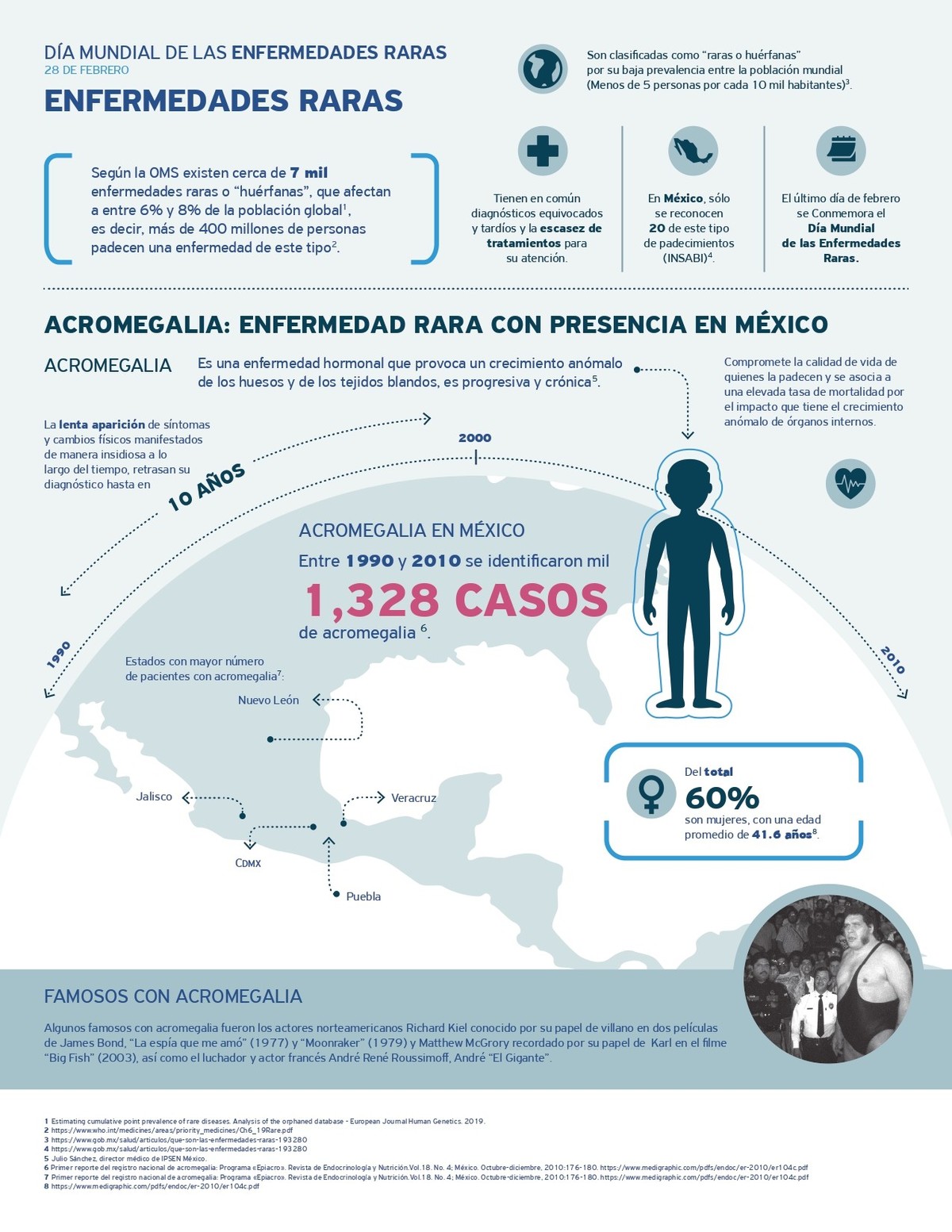 En México, sólo se reconocen 20 de este tipo de enfermedades raras, según datos del Instituto de Salud para el Bienestar, Insabi. Sin embargo, el que no exista su reconocimiento como tal, no significa que la presencia de estos padecimientos sea nulo entre los mexicanos, tal es el caso de la acromegalia.