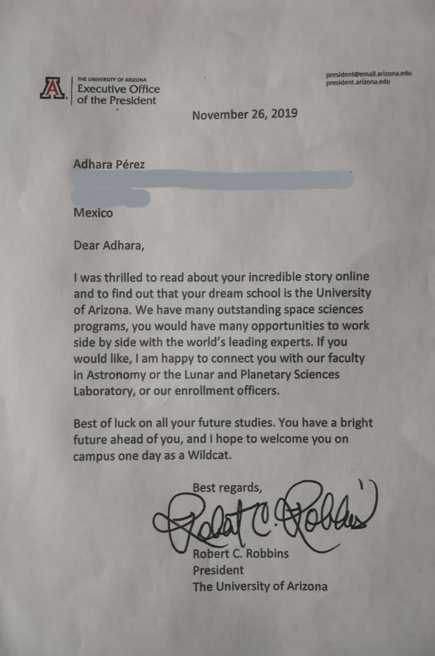 El presidente de la Universidad de Arizona, Robert C. Robbins, envió una carta a la niña superdotada Adhara Pérez Sánchez para invitarla a matricularse en su Facultad de Astronomía, por lo que el próximo verano comenzará con los cursos intensivos de inglés, reveló la madre de la menor, Nayeli Sánchez.