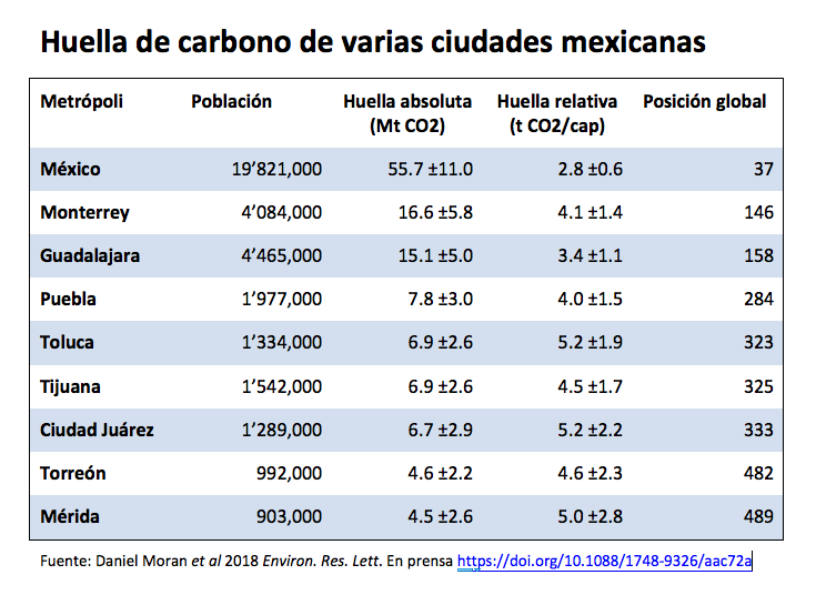 La Ciudad de México encabeza la lista. La capital del país ocupa la posición 37 a nivel global, y responde por 55.7 megatoneladas (Mt) anuales de CO2 equivalente (con una incertidumbre del orden de 11 Mt). Pero es la reina de las emisiones gracias a su población de 19.8 millones de habitantes. Le siguen en la lista Monterrey (emisión anual, 16.1 Mt), Guadalajara (15.1 Mt), Puebla (7.8 Mt) y Toluca (6.9 Mt).Pero si se piensa en las emisiones a nivel personal, el orden cambia drásticamente: la ciudad con más emisiones per cápita es Toluca, con 5.2 toneladas per cápita (incertidumbre, 1.9 t), le siguen Ciudad Juárez (5.2 t), Mérida (5.0 t), Torreón (4.6 t) y Tijuana (4.5 t).