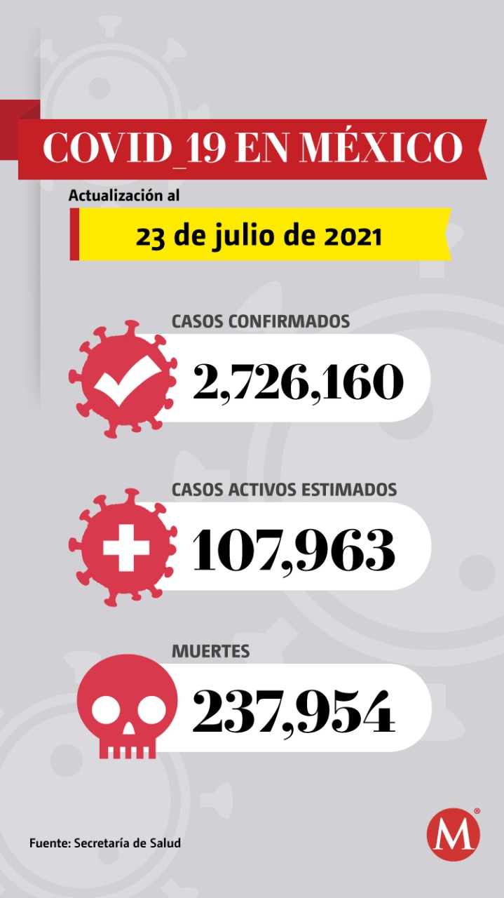 En el documento también se informó que actualmente hay 107 mil 963 casos activos estimados y 2 millones 129 mil 788 personas se han recuperado de la enfermedad.