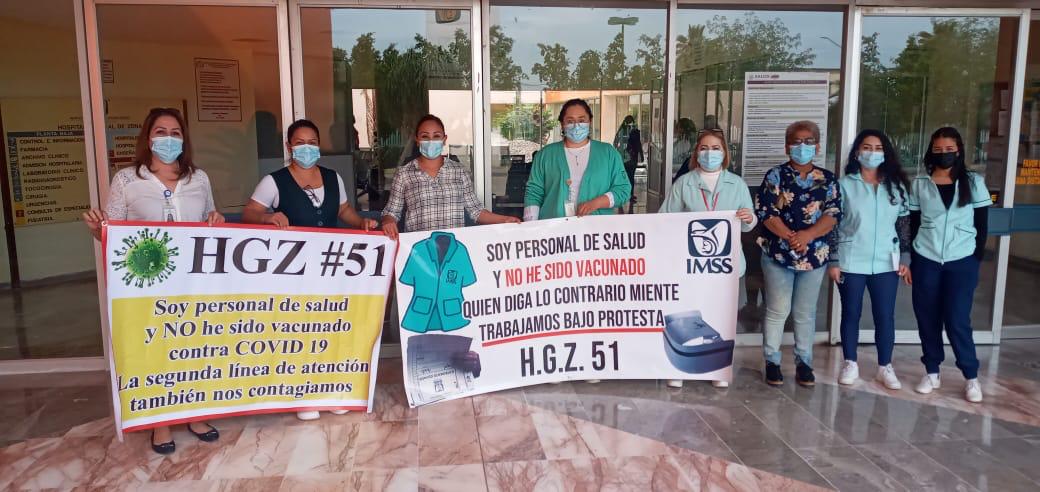 Durante el jueves pasado trabajadores de la Clínica 51 del Instituto Mexicano del Seguro Social en Gómez Palacio se manifestaron y establecieron que continuaban sus labores bajo protesta debido a que las asistentes de médicos, camilleros, así como el personal de cocina, limpieza y administrativo, no ha recibido la vacuna contra el coronavirus a pesar de que la instalación fue asignada por la presidencia de la República como hospital covid.