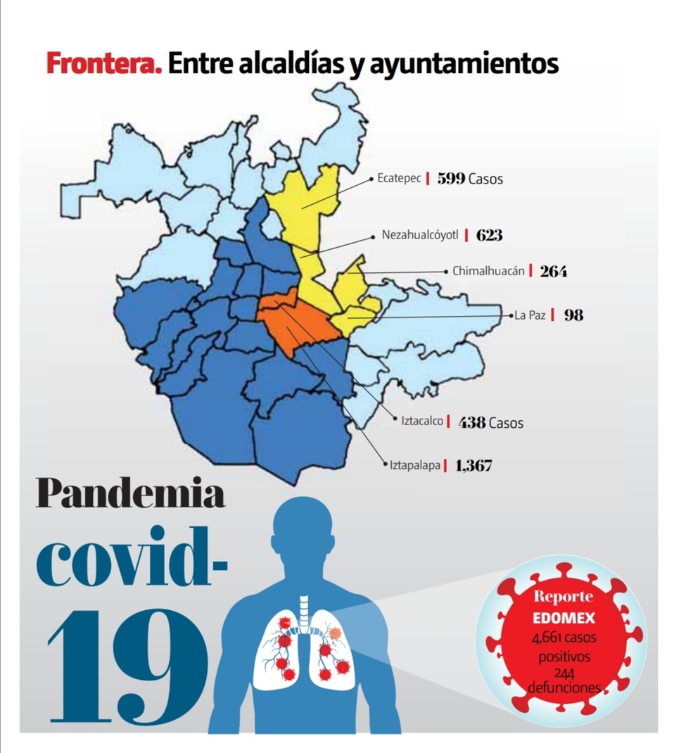 El Estado de México alcanzó este miércoles los 4 mil 661 casos positivos de covid-19, de los cuales, mil 629 son altas sanitarias, mil 056 se encuentran en resguardo domiciliario, mil 104 pacientes están hospitalizados en nosocomios de la entidad y 513 en otros estados. En su informe diario, la Secretaría de Salud informó que hasta este miércoles se habían registrado 244 fallecimientos de mexiquenses en territorio estatal, mientras que 115 han perdido la vida fuera de éste.