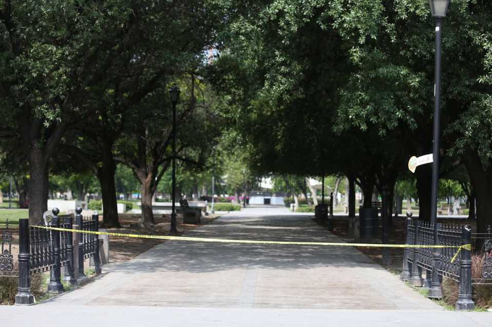 Elementos de la Secretaría de Seguridad Pública y Vialidad de Monterrey colocaron cinta amarilla con la leyenda "Prohibido el paso" en distintas plazas públicas de la ciudad, como medida para evitar aglomeraciones de personas y así reducir al mínimo los contagios por coronavirus.