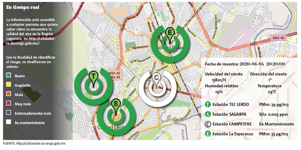 De acuerdo con la información de la Red de Monitoreo de la calidad del aire de la Región Lagunera de Durango, manejada por la Secretaría de Recursos Naturales y Medio Ambiente, de los últimos días de marzo y durante mayo se registró una reducción de hasta un 35 por ciento de la contaminación atmosférica.