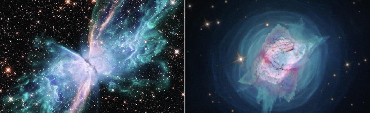 Las fotografías muestran dos nebulosas planetarias jóvenes cercanas, NGC 6302, denominadas Nebulosa Mariposa, y NGC 7027. Ambas se encuentran entre las nebulosas planetarias más polvorientas conocidas y ambas contienen masas de gas inusualmente grandes, lo que las convirtió en un par interesante para estudiar en paralelo por un equipo de investigadores.