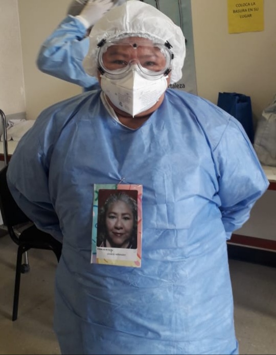 “Así a mí me da más seguridad y al paciente en la atención que yo le voy a dar y me siento orgullosa de portarlos y que sepan quién es la persona que los está atendiendo”, dice con la voz entrecortada, mientras se alista con todo el equipo de protección y lleva pegado en su pecho la calcomanía con su rostro.