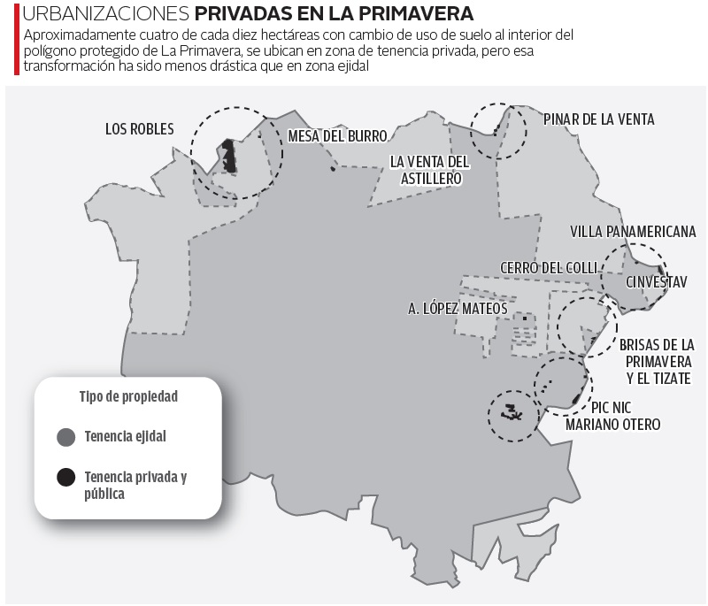 Fraccionamientos privados y ejidales en el interior del polígono protegido de La Primavera