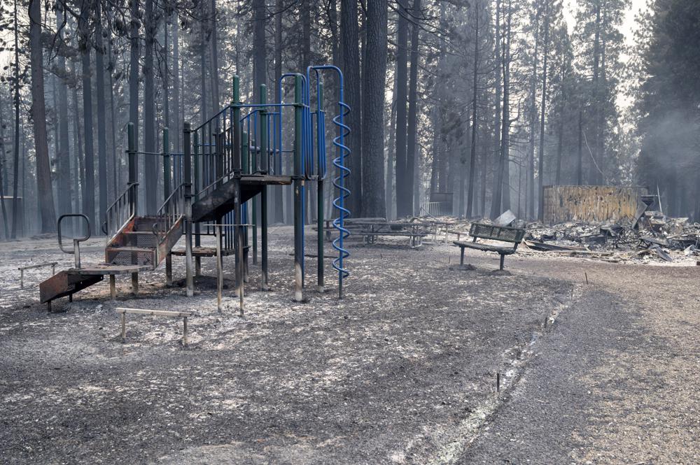 Muy pocas casas quedaron en pie en Grizzly Flats, donde las calles estaban llenas de postes y líneas eléctricas caídas. Las casas se redujeron a cenizas humeantes y metal retorcido con solo chimeneas que se elevaban sobre las ruinas. También se destruyeron una oficina de correos y una escuela primaria.