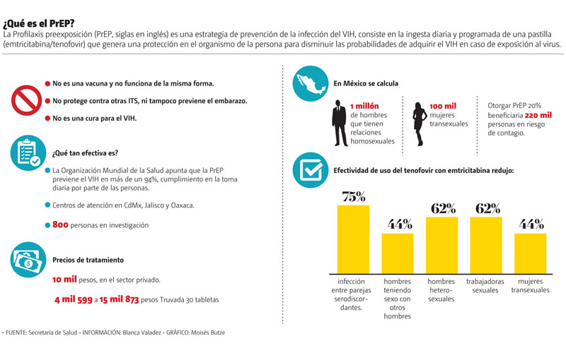Carlos Magis Rodríguez, quien forma parte de la investigación del Instituto Nacional de Salud Pública (INSP), explicó que aunque en el país ya se encuentra circulando la Profilaxis Previa a la Exposición (Prep), este tratamiento cuesta en el sector privado unos 10 mil pesos, a pesar de contener sustancias genéricas, y la idea es que el gobierno lo adquiera a 800 pesos.