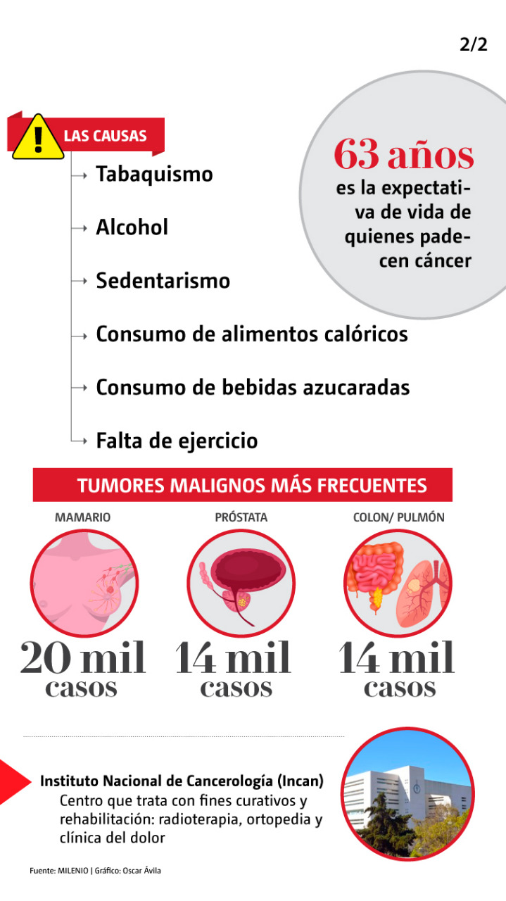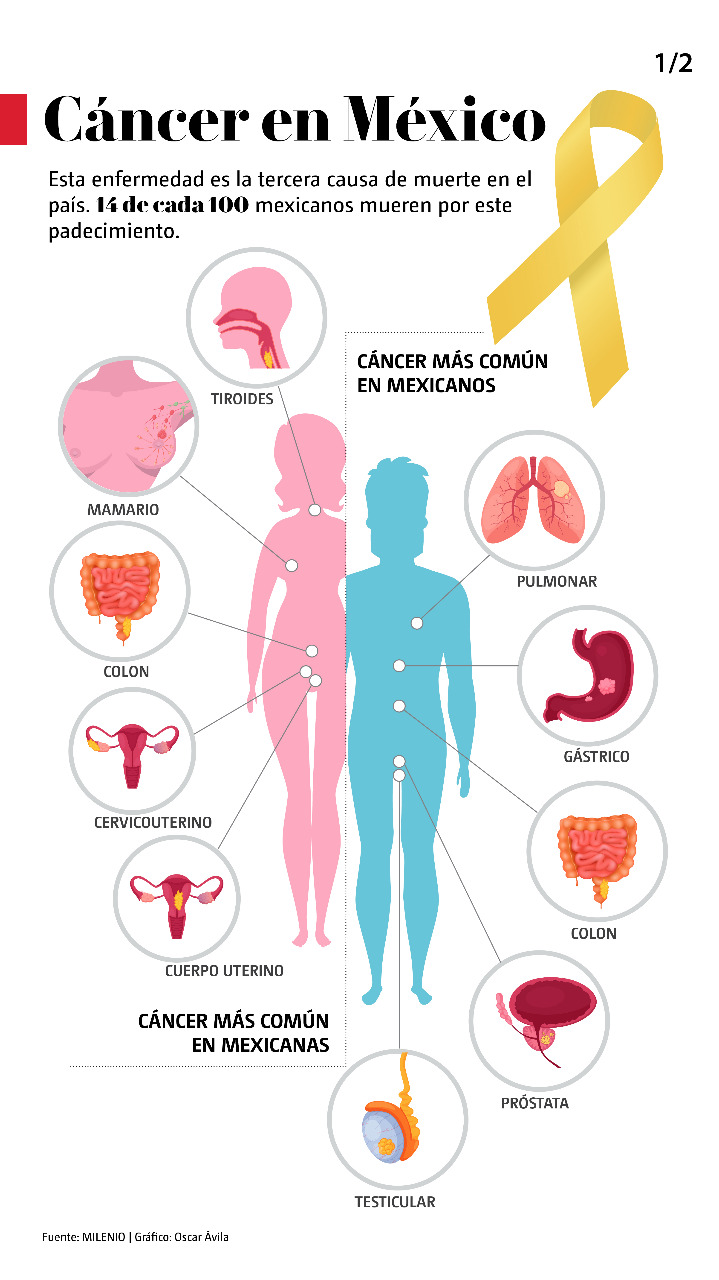 Cifras del Instituto Nacional de Cancerología (INCan) señalan que en México, el cáncer es la tercera causa de mortalidad. En el caso de las mujeres, los tipos de cáncer más comunes son los de mama, tiroides, cervico – uterino, útero y colorrectal; mientras que en hombres próstata, colorrectal, testículo, pulmón y estómago.