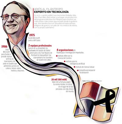 “Con gran tristeza anunciamos la muerte de nuestro fundador Paul Allen, cofundador de Microsoft (...) Falleció en la tarde del lunes 15 de octubre de 2018, por complicaciones de un linfoma no Hodgkin en Seattle”, se señaló en un comunicado de Vulcan, firma que Allen fundó.