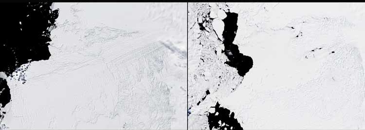 La lengua de hielo, una espesa masa de hielo flotante la cual se sitúa desde el glaciar Thwaites hasta la Antártida occidental y el mar de Amundsen se ha fractura y perdido gran parte por el cambio climático. La primera imagen fue tomada en el 2001 y la segunda en el 2011.