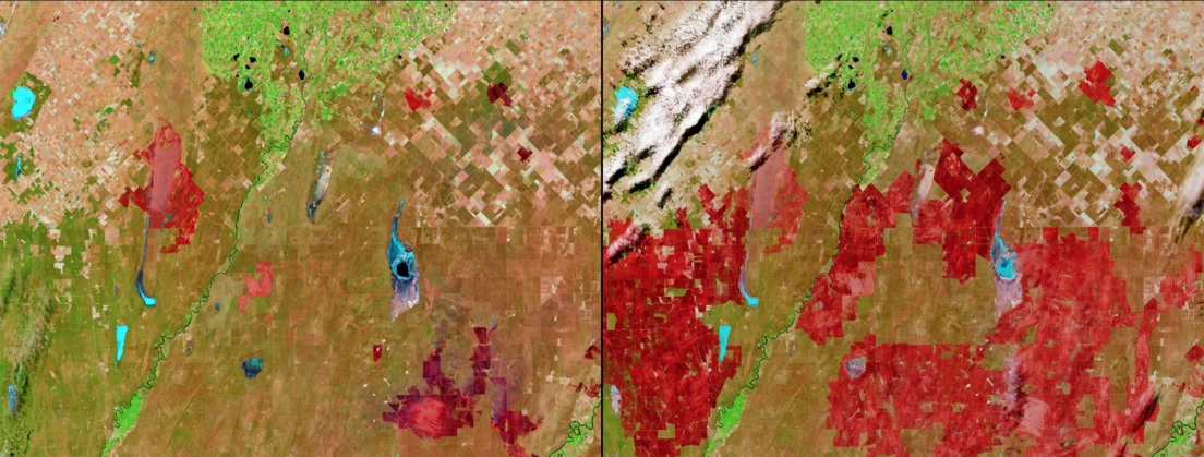 Debido a los incendios forestales, algunas zonas también han sufrido cambios. En esta imagen se muestra que debido a estos hechos, miles de hectáreas en la región pampanea en Argentina han resultado afectadas. La primera imagen fue tomada el 22 de diciembre de 2016 y la segunda el 7 de enero del 2017.