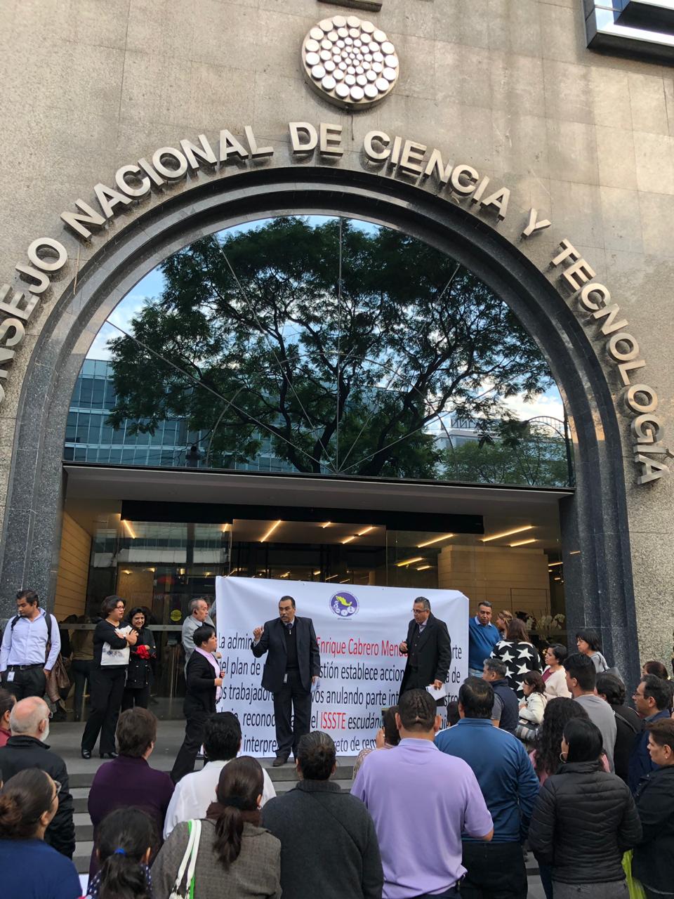Trabajadores del Consejo Nacional de Ciencia y Tecnología, Conacyt, se plantaron ante la oficina del director general, Enrique Cabrero Mendoza, molestos porque la mañana del martes 27 de noviembre la administración les avisó que conforme a la ley, los empleados de confianza perderían sus prestaciones y beneficios derivados de su antigüedad.