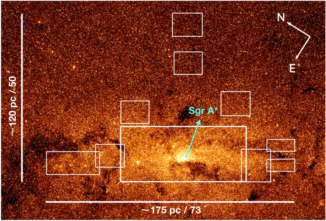 Sin embargo, no es sencillo observar el Centro Galáctico. Las densas nubes de gas y polvo situadas entre la Tierra y el centro de la Vía Láctea causan un enrojecimiento y una extinción extrema en la luz visible emitida en el núcleo de la Vía Láctea. Por ello, las estrellas en esta región solo se pueden estudiar en el infrarrojo, rango menos sensible a estos efectos (en este caso, se empleó la camera infrarroja HAWK-I del telescopio Very Large Telescope del Observatorio Europeo Austral).