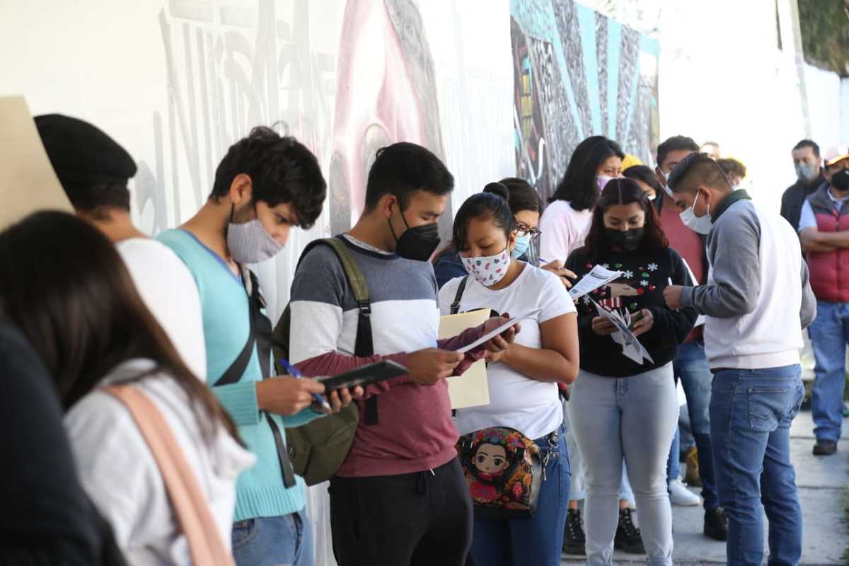 Los jóvenes esperan a que abran la secundaria para vacunarse. Algunos están abrigados con chamarras, otros visten de pants, shorts, en las manos llevan el registro de su expediente, unos matan el tiempo en su celular y algunos están acompañados de sus padres.
