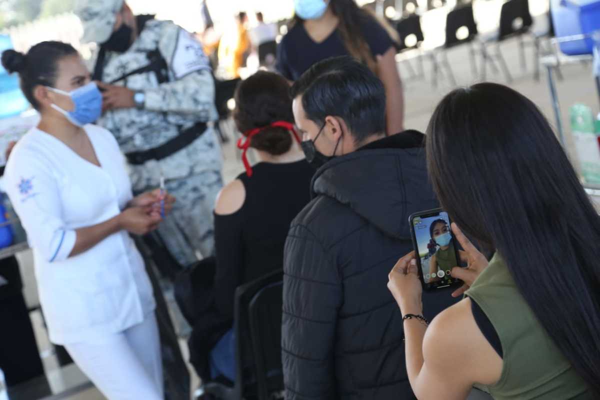 Algunos esperan su turno, otros se toman una selfie mientras reciben la vacuna, unos muestran los tatuajes en los brazos a la hora de recibir el biológico. El personal de la Delegación del Bienestar ordena la fila de jóvenes que esperan su turno antes de pasar a la cancha de basquetbol y el proceso es vigilado por tres elementos de la Guardia Nacional.