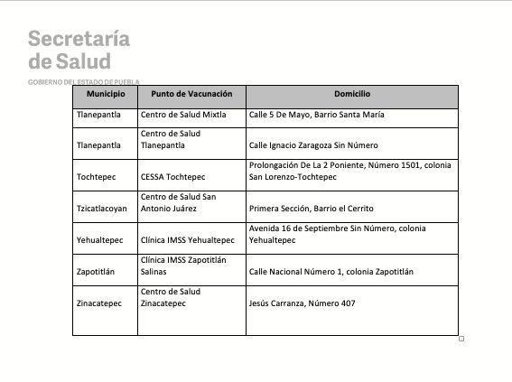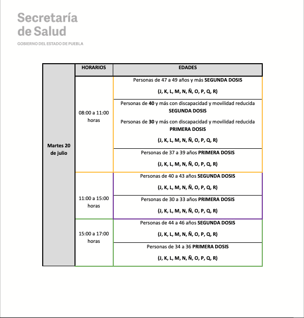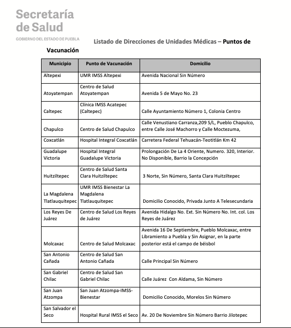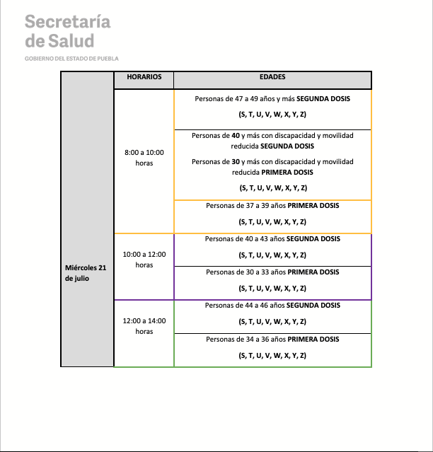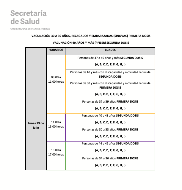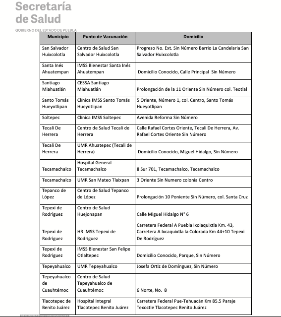 De igual manera, las instancias estatales y federales informan que quienes asistan para recibir la SEGUNDA DOSIS (40 a 49 años y embarazadas) serán vacunados en los mismos lugares donde recibieron la primera dosis; mientras que la población de PRIMERA DOSIS (30 años en adelante y embarazadas) deberá consultar la ubicación del módulo correspondiente de acuerdo a su colonia o localidad en la siguiente liga: https://previenecovid19.puebla.gob.mx/vacuna, así como en las redes sociales oficiales: @SaludGobPue y Secretaría de Salud Puebla (Twitter y Facebook, respectivamente).