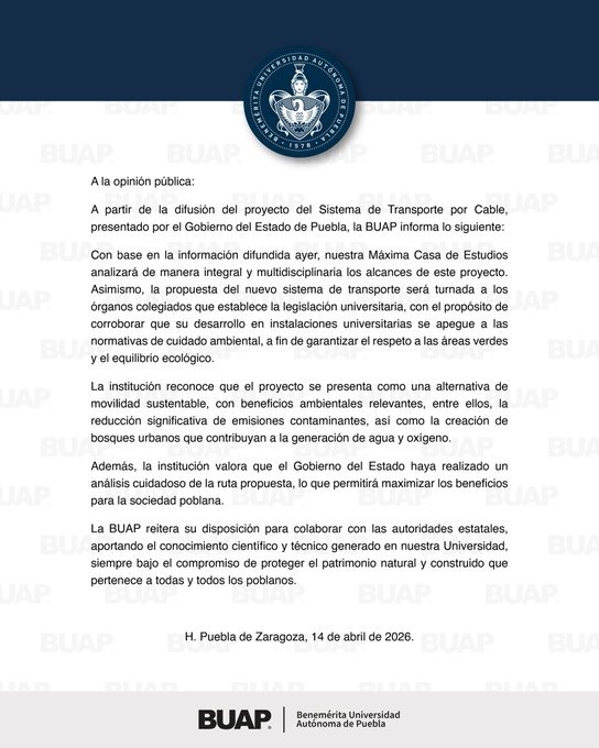 Finalmente, la BUAP enfatiza que reitera su disposición para colaborar con las autoridades estatales, aportando el conocimiento científico y técnico generado en la Universidad, siempre bajo el compromiso de proteger el patrimonio natural y construido que pertenece a todas y todos los poblanos.