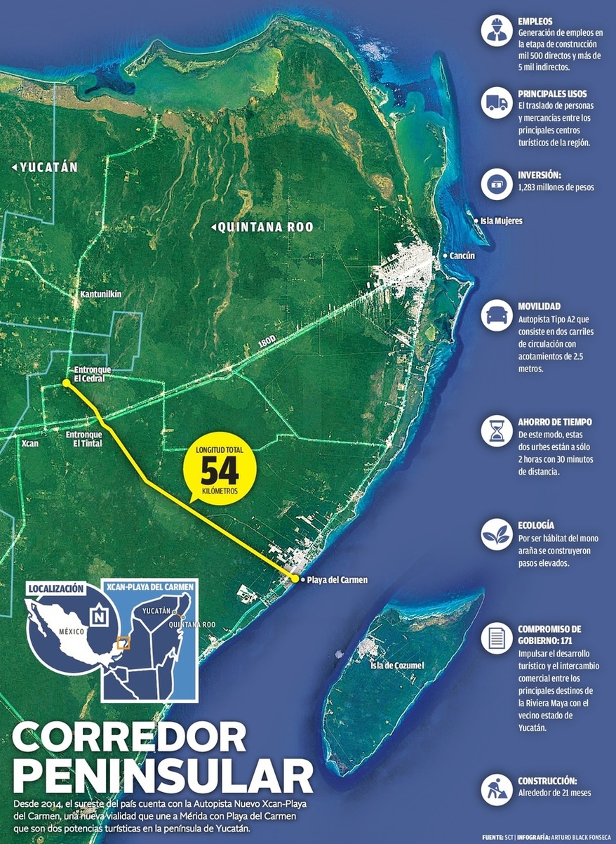 El Corredor Peninsular de Yucatán se fortaleció en 2014 con la puesta en marcha de la Autopista Nuevo Xcan-Playa del Carmen, que se desprende de la vialidad entre Mérida y Cancún.