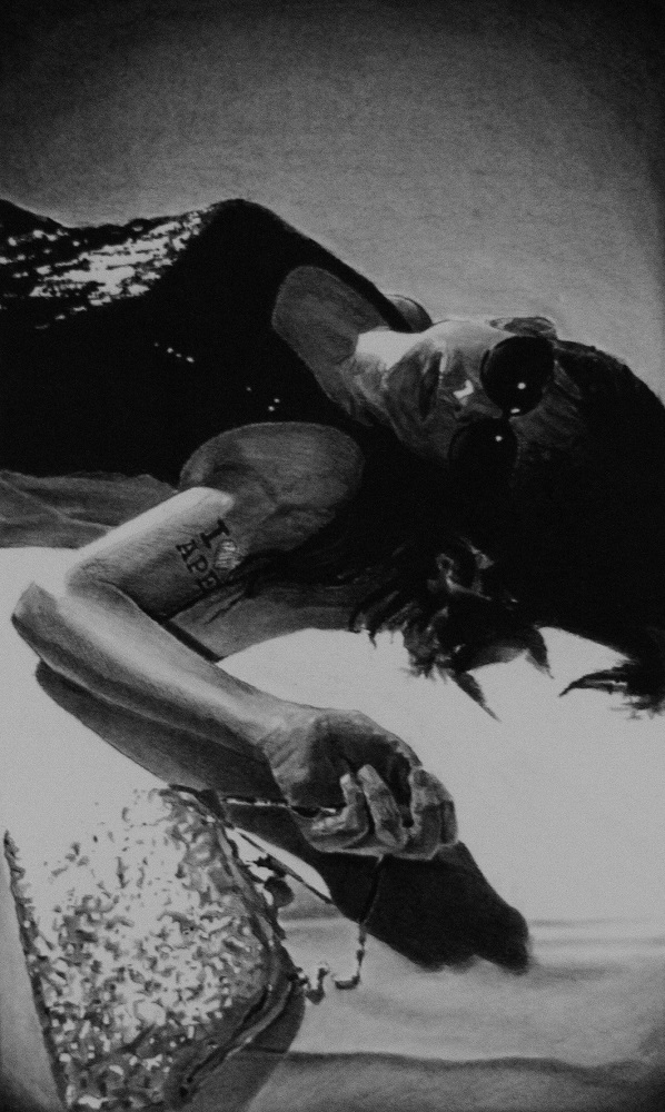 En su pintura, siempre está presente el color, maneja contraste entre el color y el negro. En esta ocasión que fue dibujo en blanco y negro, nos habla de este reto técnico: “Fue regresar al punto en donde inicié. Cuando empecé en esto en el arte, las primeras técnicas que empecé a dominar fueron el carbón, el papel, la tinta. Cuando descubrí el óleo, abandoné el carbón; abandoné la tinta y se me vuelve a presentar otra vez el reto. Recordar cómo se hacían las cosas. En el caso del carbón, pues alcanzas unos oscuros padrísimos. Se vuelve una cuestión muy delicada. Porque el carbón es una tierra que se esparce y, en el caso de la tinta, se absorbe. Entonces yo lo he dicho: son piezas que no me permiten el error. Requería de mucho cuidado. Me gusta mucho, porque el blanco y negro también te recuerda esa época de ese cine blanco y negro, claroscuros, te lleva a la época de la canción”.