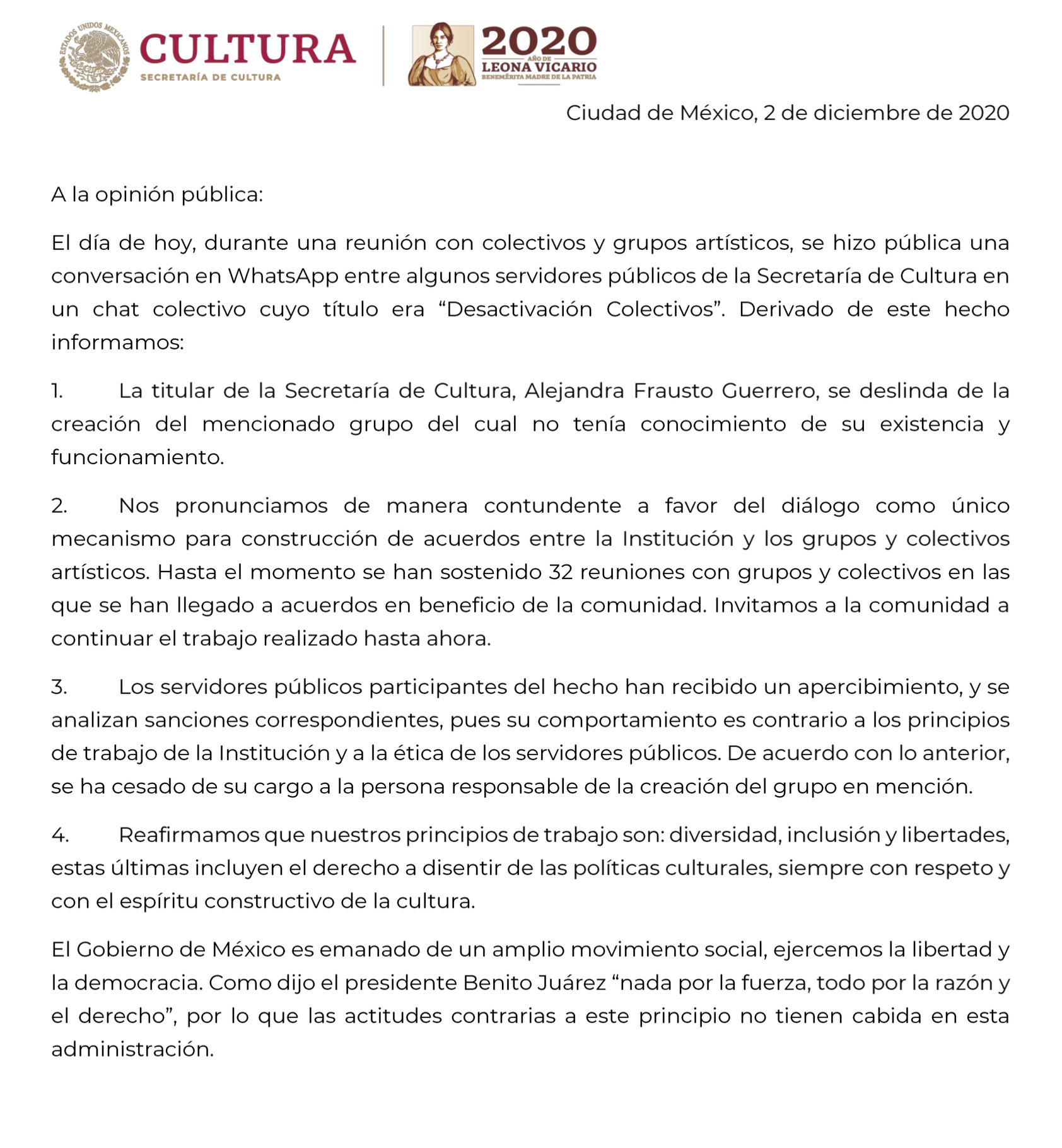 La titular de la Secretaría de Cultura emitió un comunicado para deslindarse y decir que desconocía la existencia de ese chat, en el que están Esther Hernández, directora de Vinculación Cultural; Pablo Raphael, director de Promoción y Festivales Culturales; Paula Vázquez, asesora jurídica de la Subsecretaría de Desarrollo Cultural; Ángeles Castro, directora del Centro Nacional de las Artes, y Alejandro Ortiz, entre otros; al parecer este último es el supuesto creador del chat, al que habrían destituido por órdenes de la propia secretaria.