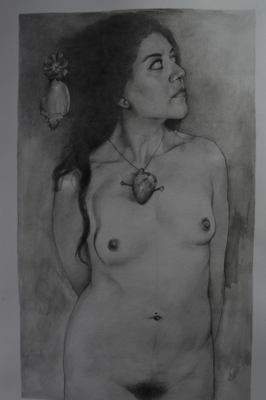 La mujer del dibujo de Alejandro tiene colgado en el cuello un corazón. Alejandro nos explica: “Es esta cuestión del sentimiento, del amor, como Ema habla. Es un corazón sangrado, colgando de un cordón, el sentimiento son esos clavos. Es un sentimiento de dolor, amar también duele. Al final lo traes ahí colgando, es un fetiche, siempre está ahí, es parte de ti. Es muy simbólico, vas a tenerlo toda la vida. El dibujo también habla del pasado que siempre está presente, lo represento en el caracol. El pasado te forma tus sentimientos. El hecho de que ella está volteando hacia un lado, hacia el futuro, lo que viene. No se detiene a mirar al pasado, es esta decisión de seguir amando, a pesar de este corazón con clavos. La desnudez es estar expuesto a estos sentimientos, a estas emociones”.