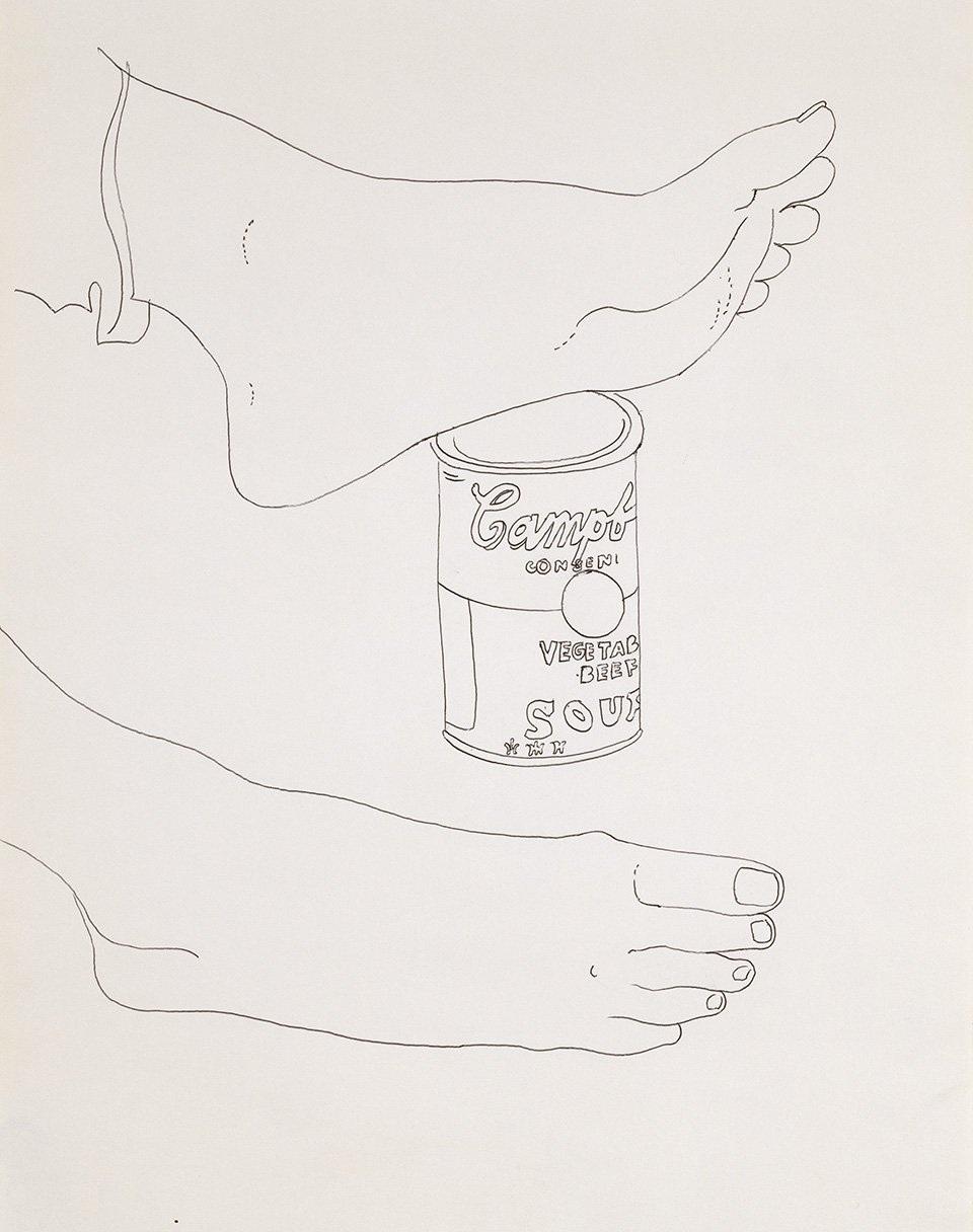El pie desnudo de un joven toca una lata de sopa Campbell, objeto que años más tarde Andy trabajará en óleos y serigrafías con gran éxito comercial. En suma, "muchachos oliendo el fuerte humor del otro" como se lee en un poema de Harold Norse que también acompaña los dibujos contenidos en el libro lanzado por la editorial Taschen hace un par de meses.