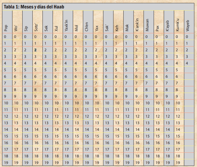 - El Haab: Es un calendario de 365 días que, al contrario al que propone Argüelles, se basa en el ciclo solar. Está compuesto por 18 meses de 20 días cada uno, (conocidos como uinal), más un mes de 5 días (wayeb). Esparza explica que era utilizado para medir las estaciones del año y era vital para la sobrevivencia, pues de éste dependía saber cuándo cosechar.