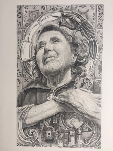 El dibujo es una compleja combinación, en donde el retrato de su madre es el centro: “Es un radio visto desde el interior, de bulbos. Mis padres tenían un radio, no tenían ni para tocadiscos. Tiene un pequeño detallito de Pedro Infante, es un camafeo donde se guardaba la foto de un ser querido. En el pecho está la cerradura del corazón, porque mi mamá era una persona que le costaba mucho abrirse, por la vida que tuvo: fue una niña huérfana que trabajó para vivir. Una vida triste la hizo muy cerrada, ya de grande tenía esa dureza”.