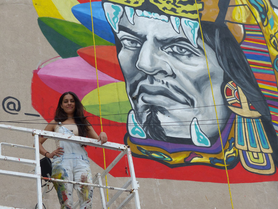 Con habilidad para movilizar una grúa, ella dirige el vehículo hasta el muro y comienza a subir. Al menos 14 metros la separan del suelo, pero mide la distancia entre sus pinturas y la pared y comienza el mural.