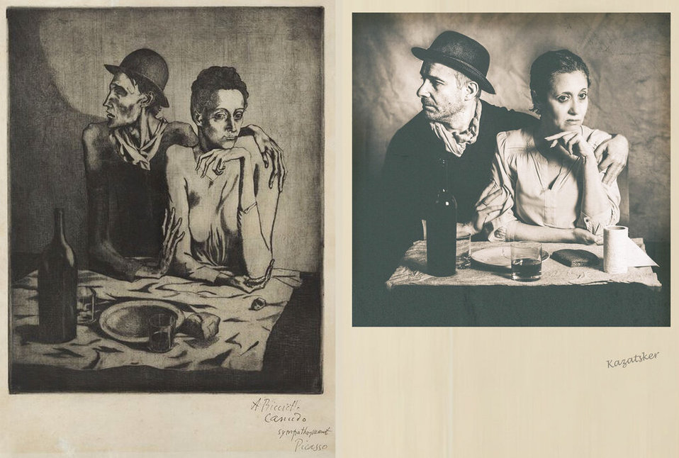 Irina Kazatsker halló que sus habilidades se adecuaban perfectamente al proyecto. La fotógrafa canadiense consiguió las luces y el trasfondo para una recreación reverente de La cena frugal de Picasso... con el agregado picaresco de un rollo de papel higiénico sobre la mesa.