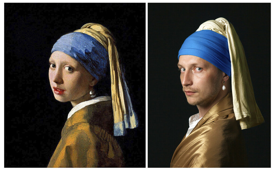 La colección contiene algunas sorpresas impresionantes. Vitaly Fonarev recreó cuidadosamente la ropa y la cofia de la Niña con un aro de perla de Johannes Vermeer y supo captar el famoso resplandor del maestro holandés. La obra es tan convincente que uno tarda varios segundos en advertir que la “niña” es un hombre con la barba bastante crecida.