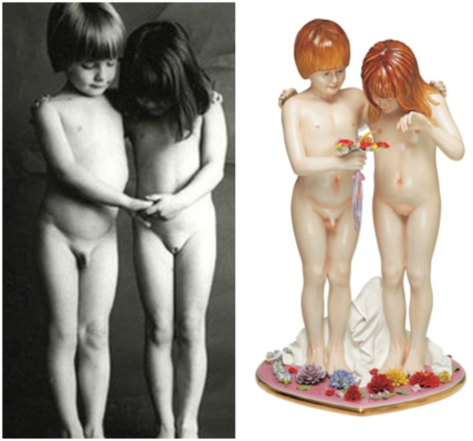 Naked es una escultura de porcelana y de poco más de un metro de alto en la que Koons representó a dos niños desnudos de pie y añadió varios elementos de decoración 'kitsch', como una base en forma de corazón con flores.