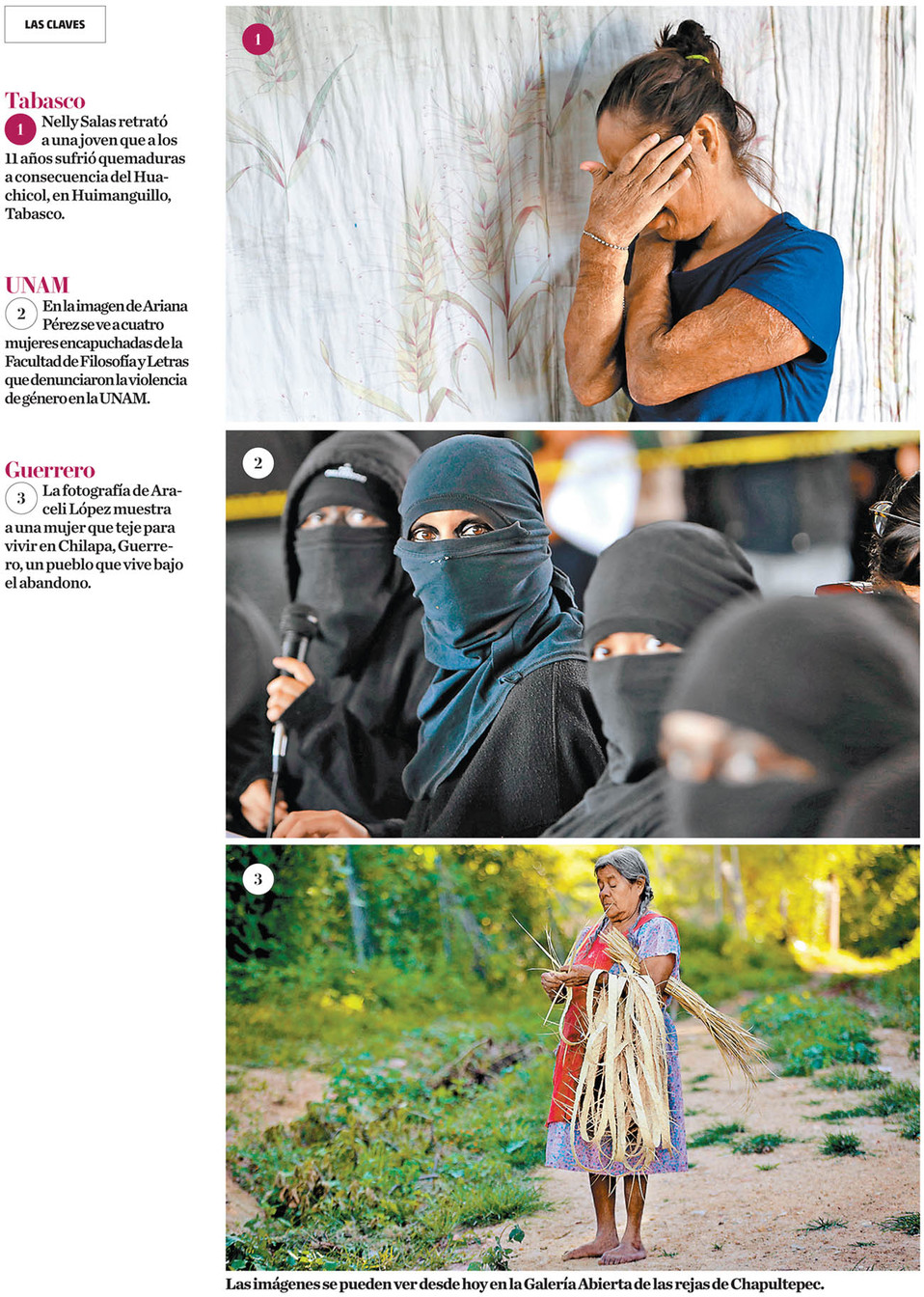 Sin importar el clima, las marchas, las desapariciones y el alto índice de homicidios en el país, Ariana Pérez, Araceli López y Nelly Salas, tres aguerridas fotoperiodistas, salen diariamente a la calle con su pesada mochila al hombro en busca del mejor ángulo: de personajes e imágenes que sinteticen parte de la realidad de este México convulso.